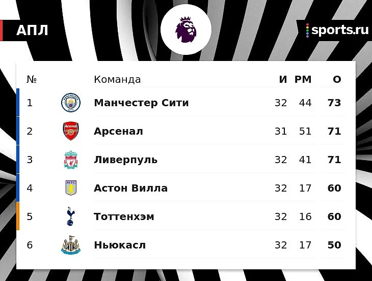 Выше «красных» идут «Манчестер Сити» (73 очка), вчера разгромивший «Лутон», и «Арсенал» (71), у которого лучше разница голов и игра в запасе.