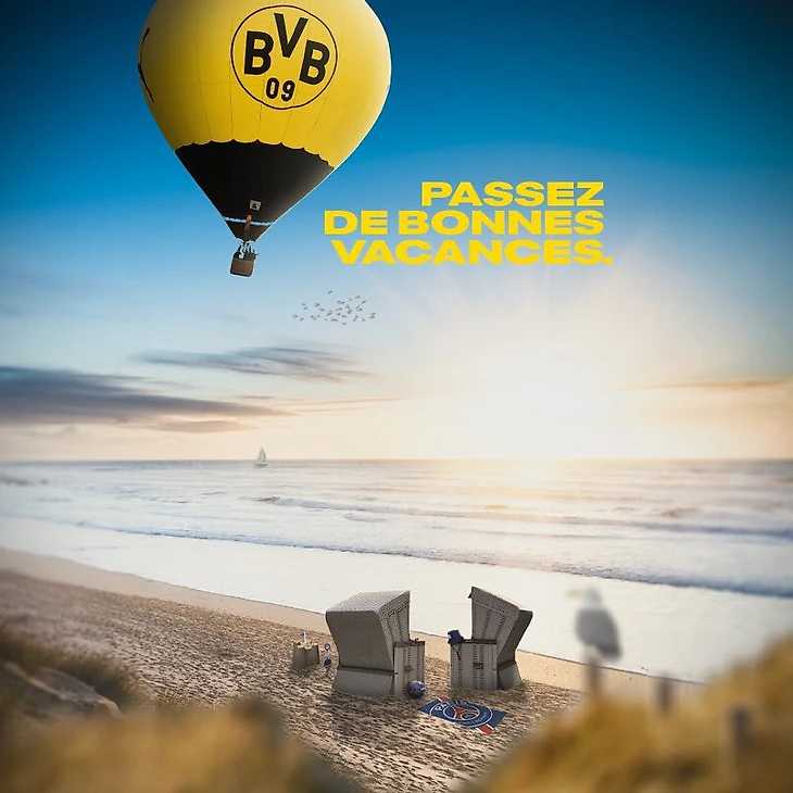 Сегодня твиттер «Боруссии» ответил на эту публикацию, выложив картинку с улетающим в небо желтым воздушным шаром с клубной эмблемой. На нем по-французски написано: «Passez de bonnes vacances» («Хорошего отдыха» – Спортс). На картинке также изображен пляж, на песке лежит коврик с эмблемой «ПСЖ».