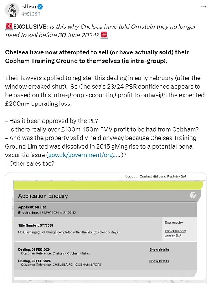 Борсон опубликовал данные, из которых следует, что юристы лондонцев в феврале, после закрытия зимнего трансферного окна, разместили заявку с целью продать базу сами себе, то есть дочерней компании внутри консорциума BlueCo, владеющего клубом.