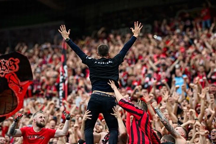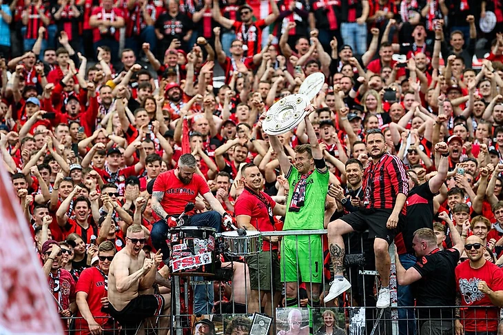 Главный тренер «Байера» Хаби Алонсо и вратарь и капитан Лукаш Градецки отнесли трофей на фанатский сектор на «БайАрене» и отпраздновали первое в истории клуба чемпионство вместе с болельщиками.