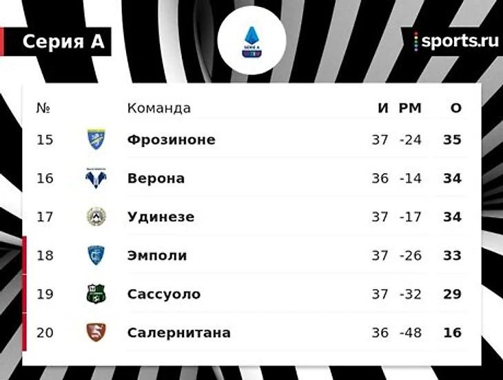 Команда идет на 19-м месте с 29 очками – отставание от спасительного 17-го места, которое занимает «Удинезе», составляет 5 очков.