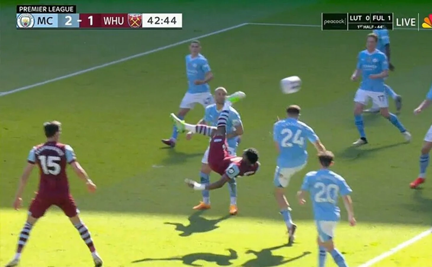 На 42-й минуте игры заключительного тура АПЛ полузащитник «Вест Хэма» после подачи с углового первым касанием подбил мяч в воздух, а вторым нанес удар в падении через себя.