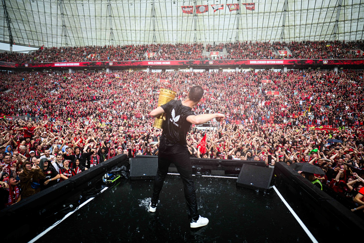 «Байер» провел чемпионский парад после победы в Бундеслиге и Кубке Германии и завершил его на «БайАрене», где собралось 40 000 фанатов