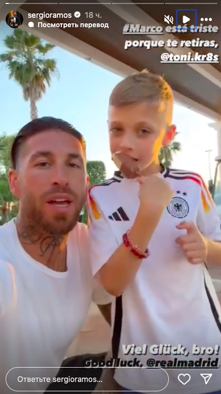 Рамос выложил видео с сыном в футболке сборной Германии и обратился к Кроосу: «Он грустит, что ты заканчиваешь. Удачи, бро! Удачи, «Реал»