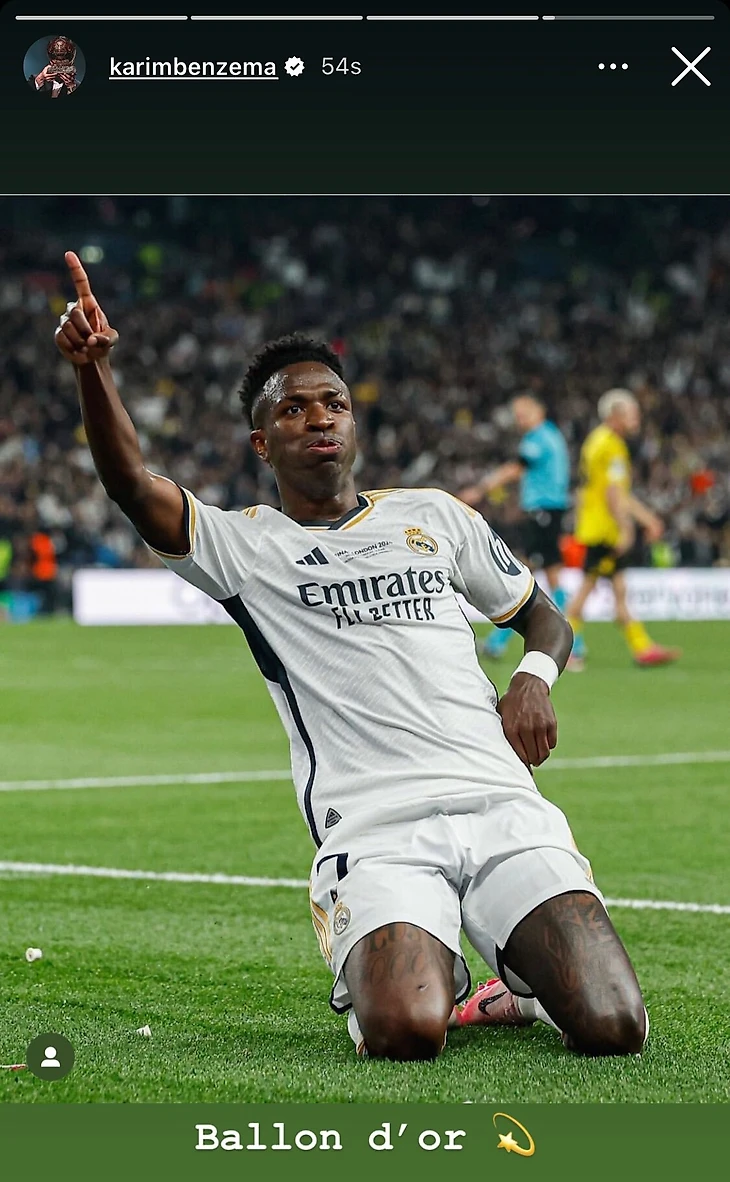 После игры Бензема, выступающий за «Аль-Иттихад Джидда», в сторис инстаграма опубликовал фотографию Винисиуса и добавил подпись: «Золотой мяч» 💫».