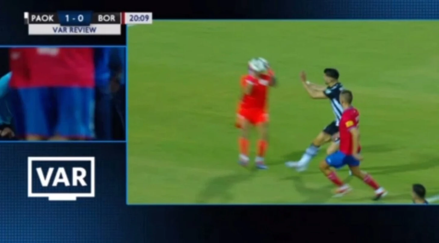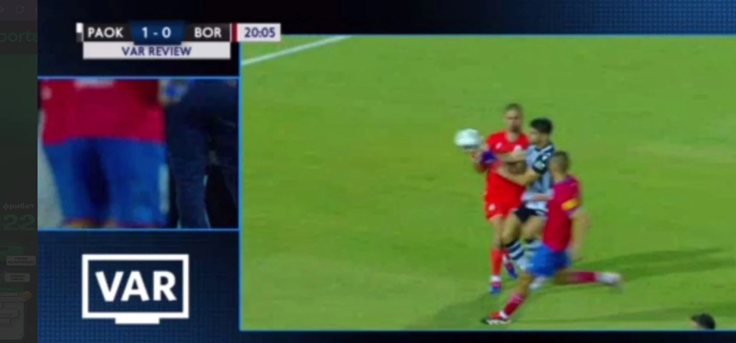 На 21-й минуте матча защитник ПАОК Константинос Кульеракис по инерции столкнулся в штрафной площади с вратарем своей команды Домиником Котарски и выбил мяч рукой.