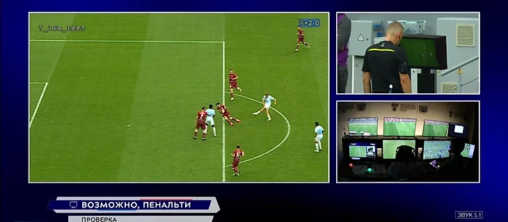 Главный судья Артем Чистяков после консультации с видеоассистентом и просмотра видеоповтора принял решение назначить одиннадцатиметровый в связи с тем, что мяч попал футболисту «Рубина» в руку.