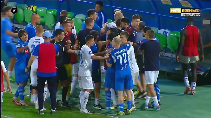 После финального свистка команды устроили стычку: футболисты команд толкали друг друга у скамеек запасных.