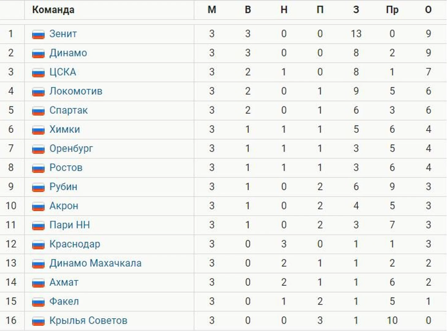 «Зенит» лидирует в РПЛ с 9 очками после 3 туров, «Динамо» отстает по разности мячей. ЦСКА – 3-й, «Локо» – 4-й, «Спартак» – 5-й, «Краснодар» – 12-й