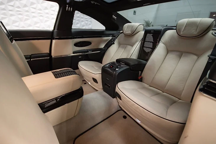 Среди характерных особенностей машины – салон, отделанный белой кожей, декоративные вставки из карбона, премиальная аудиосистема Bose, два телефона, столики для пассажиров второго ряда, встроенный холодильник и дополнительные приборы на потолке.