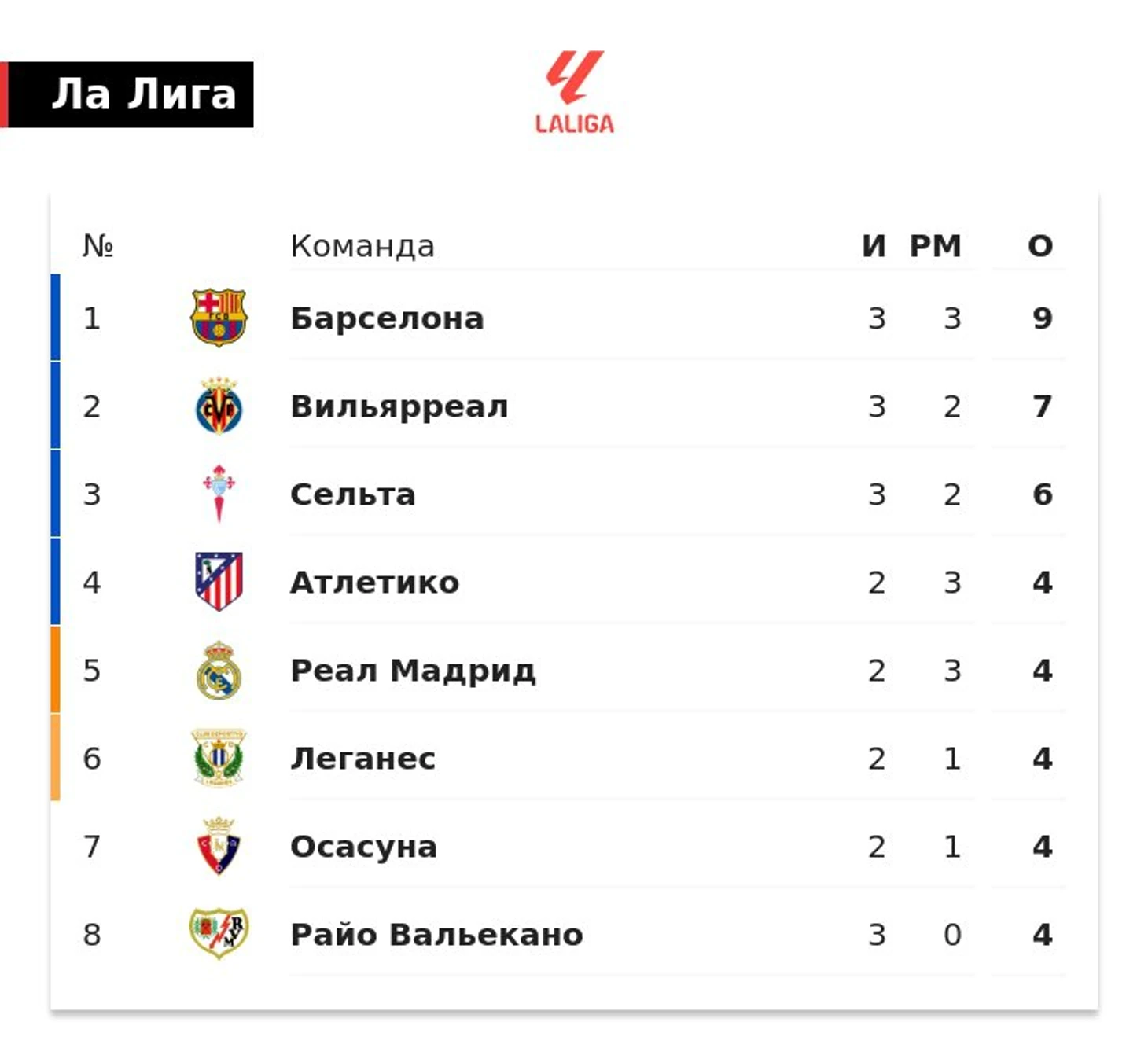Только «блауграна» еще не теряла очков в новом чемпионате – она набрала 9 баллов и возглавляет таблицу. 7 очков за 3 игры набрал «Вильярреал», 6 – «Сельта».