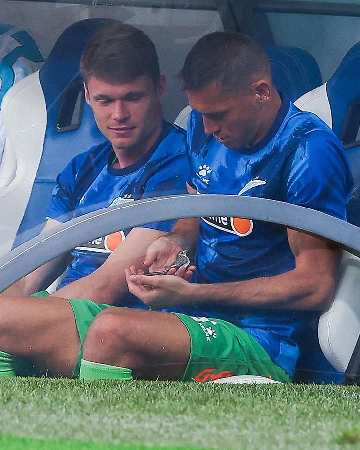 Михаил Кержаков вынес воробья с поля и сел на скамейку «Зенита» с птицей в руках.