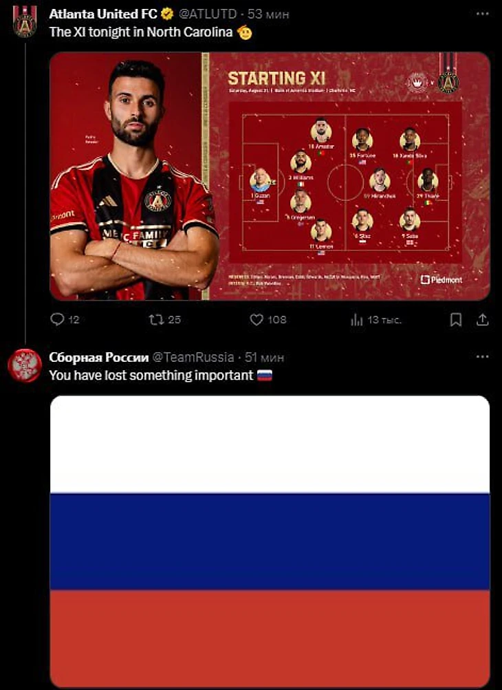 «Атланта» не указала флаг России рядом с фото Миранчука перед матчем с «Шарлотт». Аккаунт сборной России ответил: «🇷🇺 Вы потеряли что-то важное»