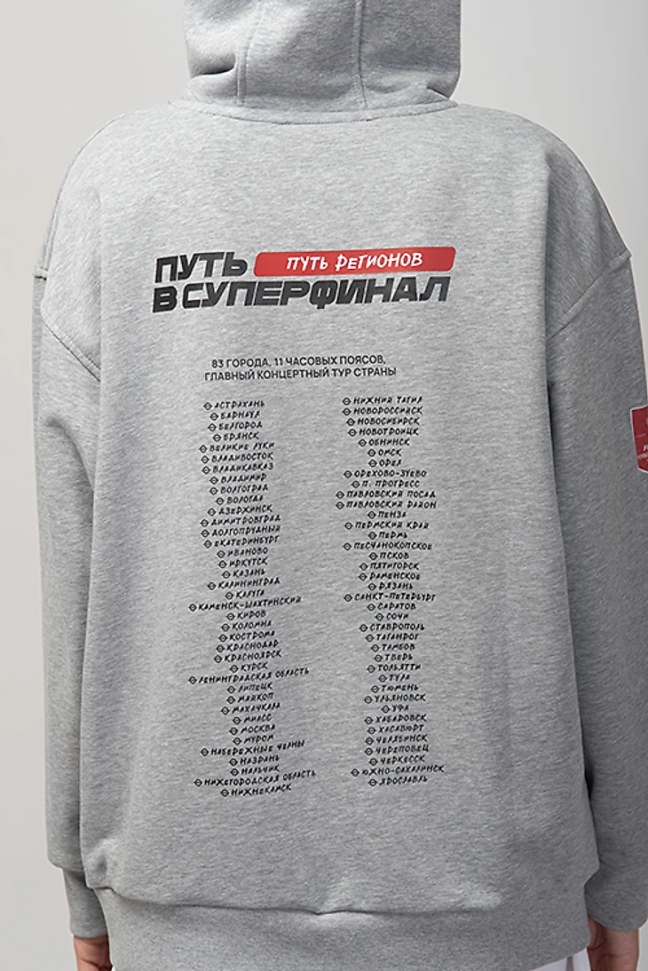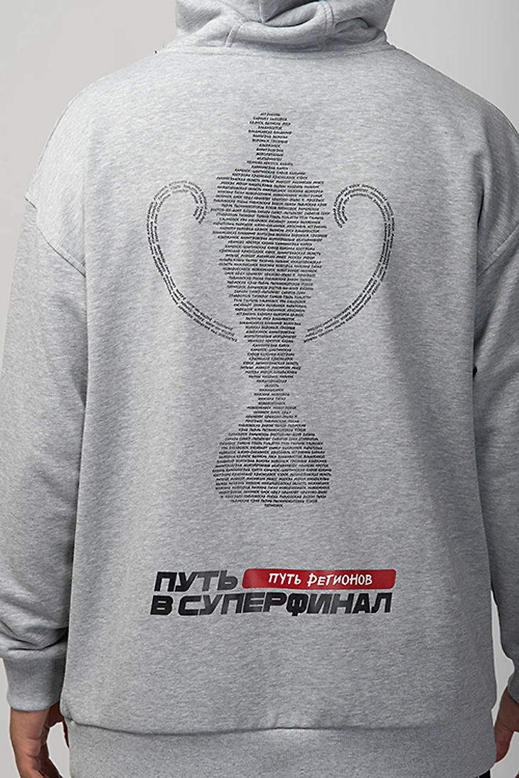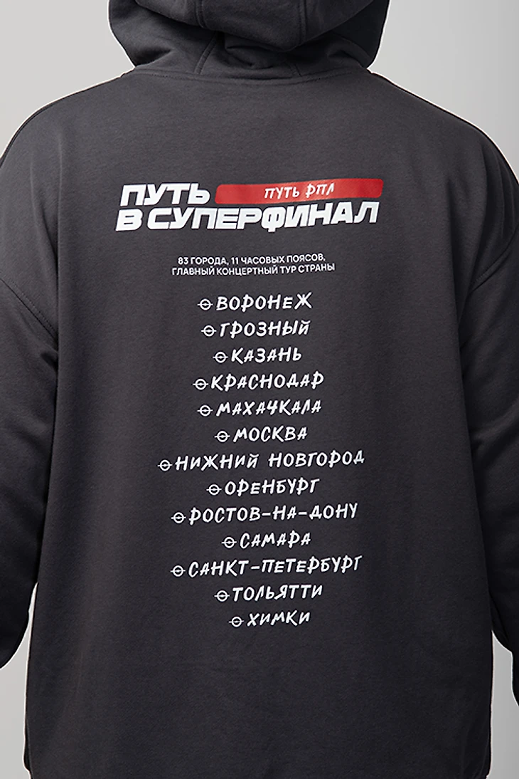Худи двух оттенков: темно-серая и светло-серая. На спине отображены города, которые участвуют в Кубке. Тур для Пути РПЛ выглядит так.