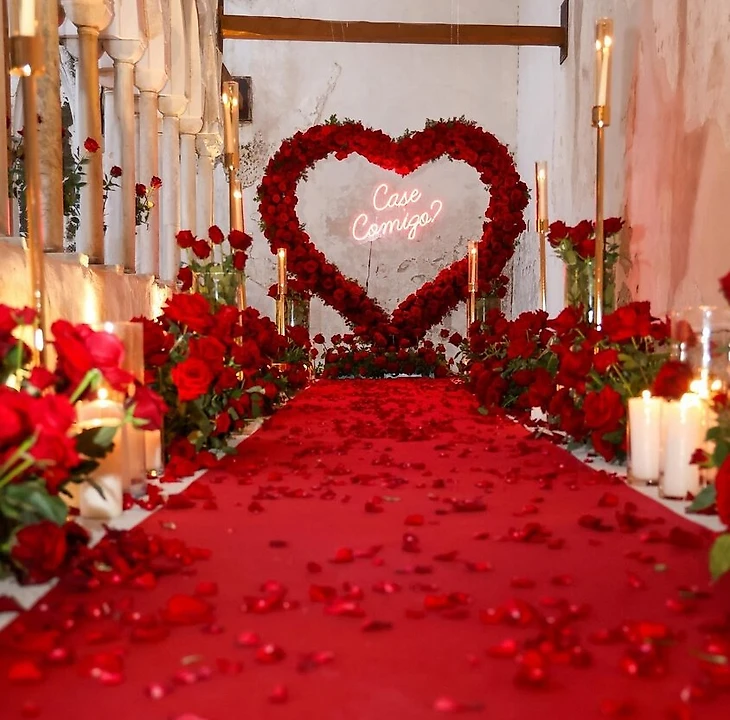 Еще на одной одном фото видно цветочную композицию в форме сердца, которая обрамляет слова слова: «Выйдешь за меня?»