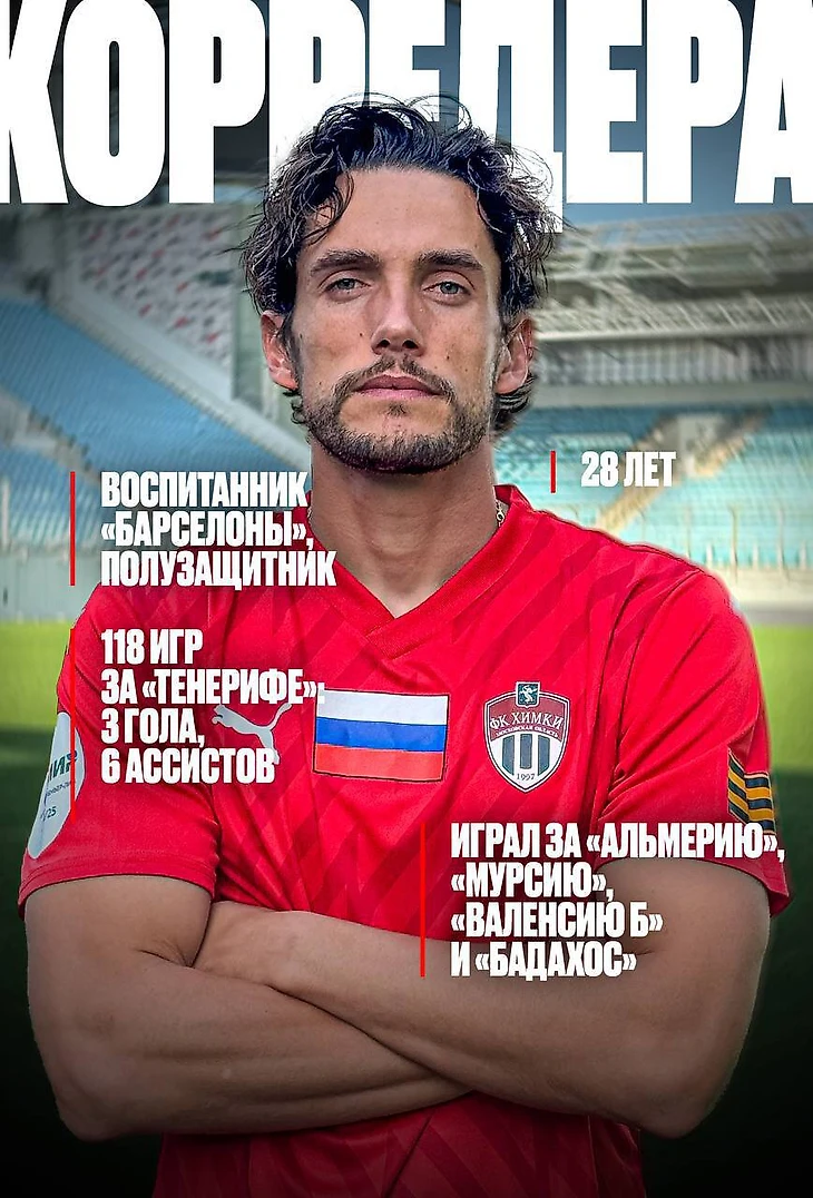 «Алекс Корредера подписал контракт с «Химками»! Испанец – воспитанник каталонской «Барселоны», в системе сине-гранатовых Алекс пробыл с 2004-го по 2015 год. Ранее полузащитник выступал за клуб «Тенерифе» из Сегунды, проведя в сумме 118 матчей и отметившись 3 голами и 6 голевыми передачами.