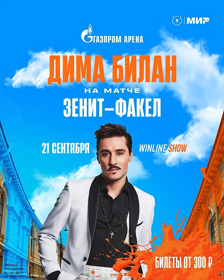 «Перед матчем на главной сцене «Газпром Арене» в рамках Winline Show пройдет выступление одного из главных артистов российской эстрады, неподражаемого Димы Билана. Певец исполнит композиции из актуального репертуара и легендарные хиты, знакомые каждому», – сказано в сообщении «Зенита».