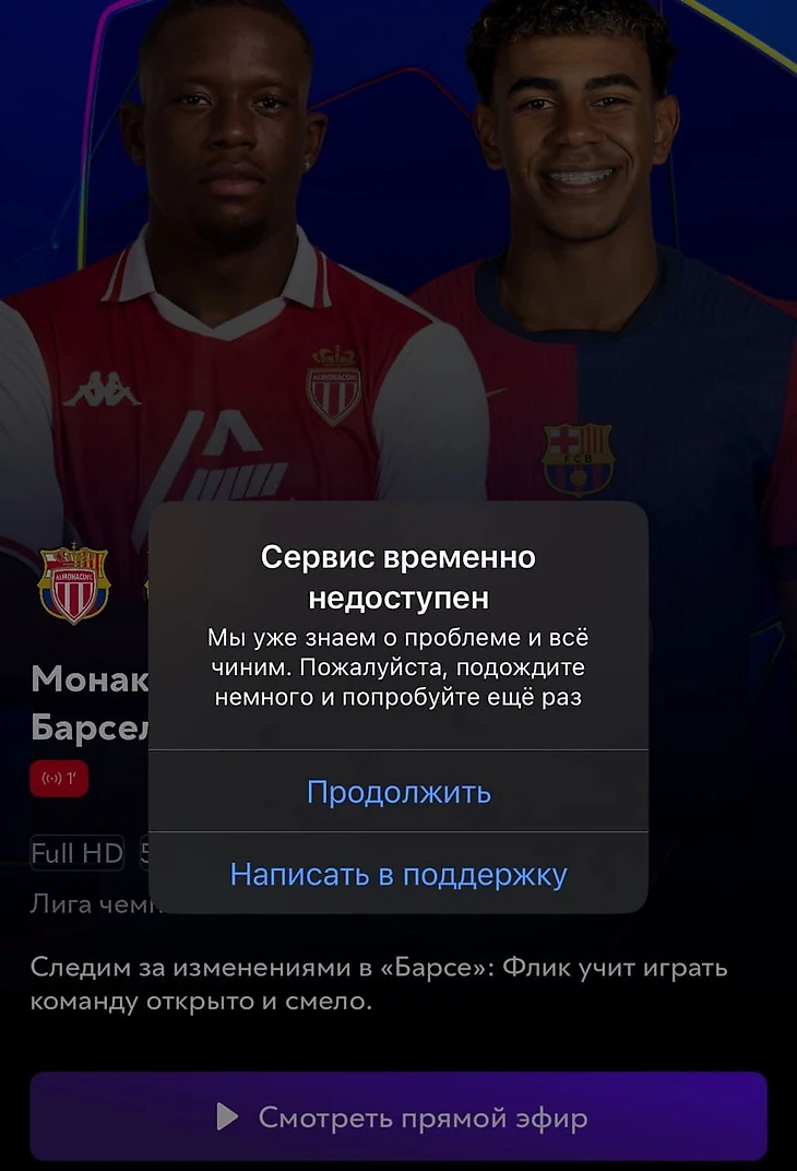 Также поступили претензии по поводу игры «Монако» – «Барселона». При попытке запустить трансляцию некоторые пользователи получали сообщение «Сервис временно недоступен. Мы уже знаем о проблеме и все чиним. Пожалуйста, подождите немного и попробуйте еще раз».