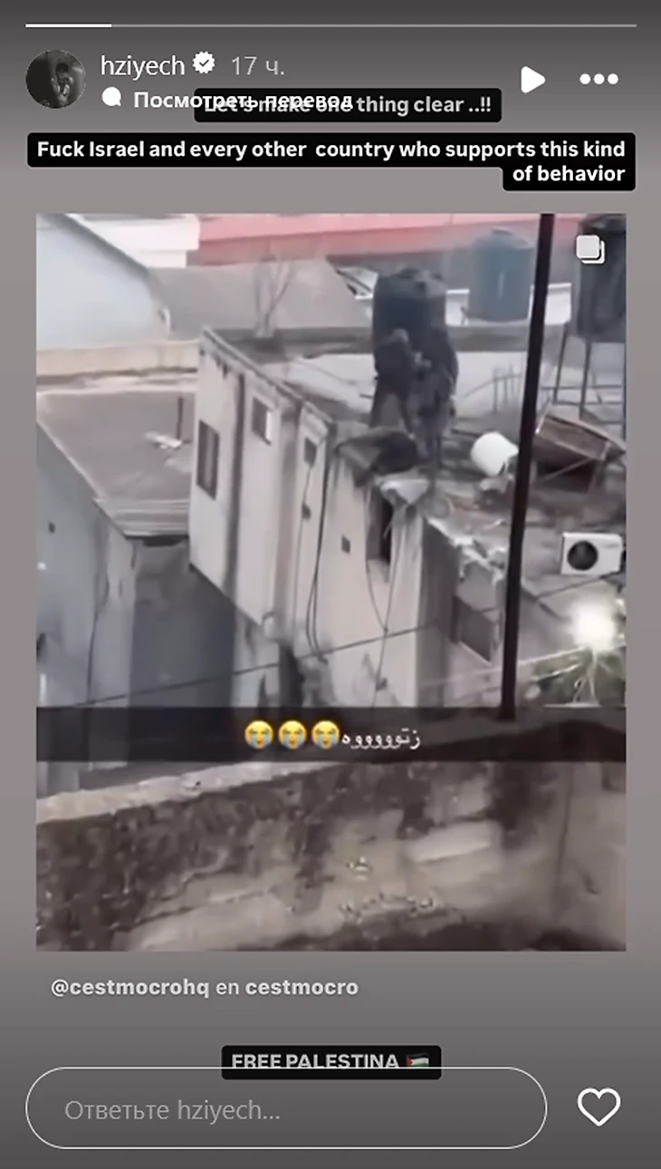 «К черту Израиль и все страны, поддерживающие такое. Свободу Палестине 🇵🇸». Зиеш об израильских солдатах в секторе Газа