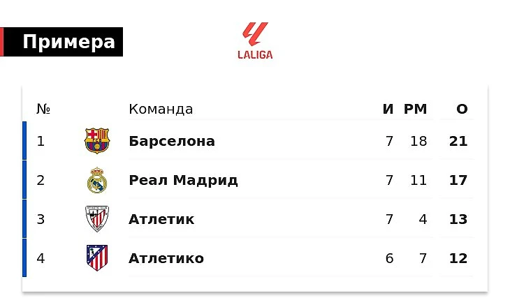 «Барселона» лидирует в Ла Лиге с 21 очком после 7 туров. «Реал» отстает на 4 балла, «Атлетик» – на 8