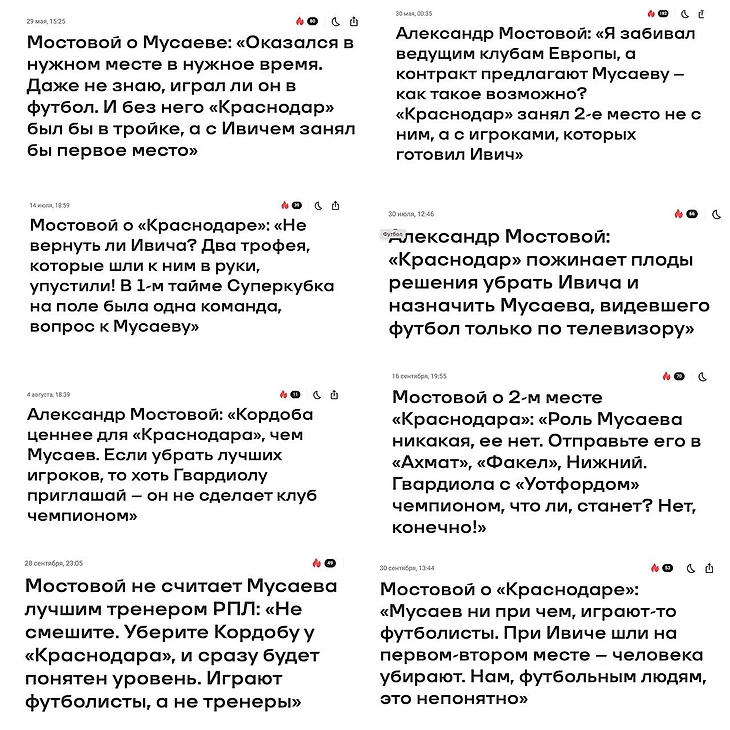 • Шнякин о 9 победах «Краснодара» подряд: «Жду комментарий нейросети «А.В. Мостовой». Мяча не знавший Мусаев продолжает топить команду, а у признанного Царем Станковича 2 победы в 7 турах»