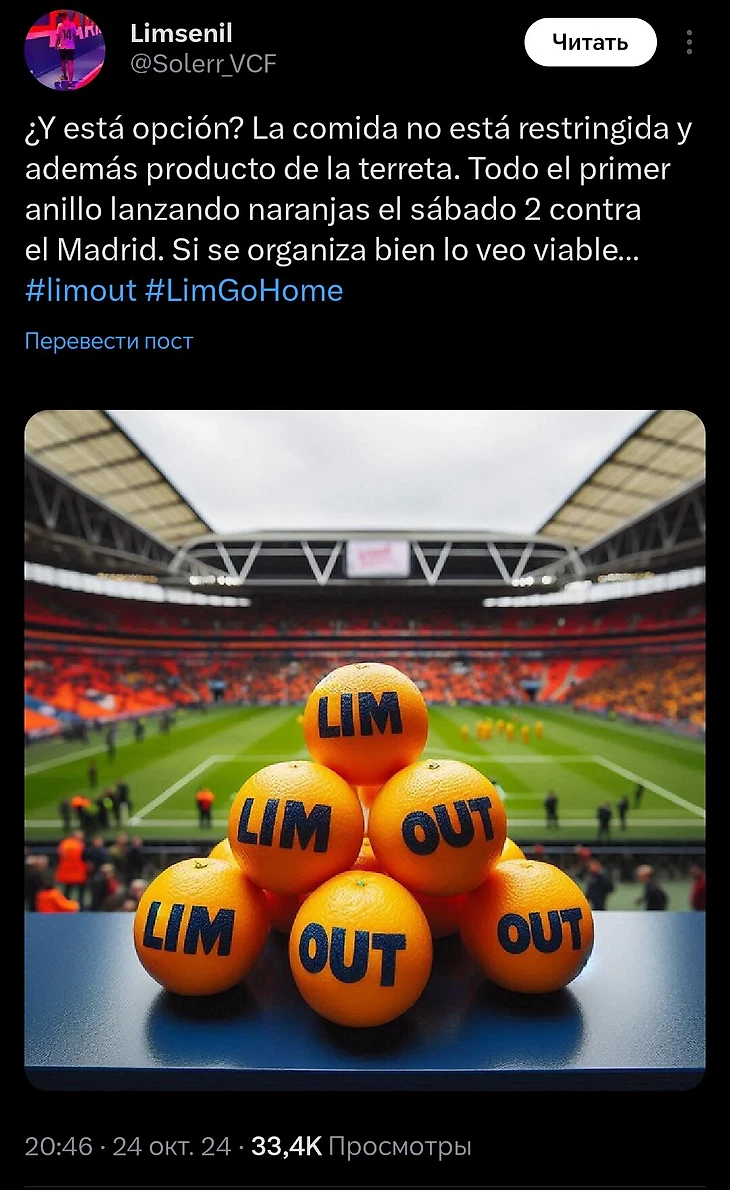 «Хватит! 2 ноября в следующем матче «Валенсии» против «Реала» на 19-й минуте бросайте на поле всевозможные предметы в знак протеста против руководства нашего клуба. Бутылки, бутерброды, апельсины, теннисные мячи, пакеты с семечками… Все это под лозунгом: «Лим, убирайся!» – говорится в одном из сообщений в твиттере.