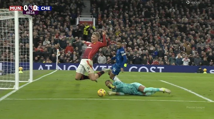 На 68-й минуте голкипер «Челси» Роберт Санчес в падении придержал руками Расмуса Хейлунда, выбегавшего один на один к воротам.
