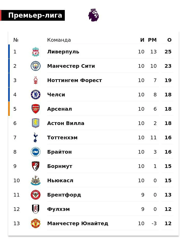 «Ливерпуль» лидирует в АПЛ после 10-го тура, «Ман Сити» – 2-й, «Ноттингем» – 3-й, «Челси» – 4-й, «Арсенал» – 5-й, «МЮ» – 13-й