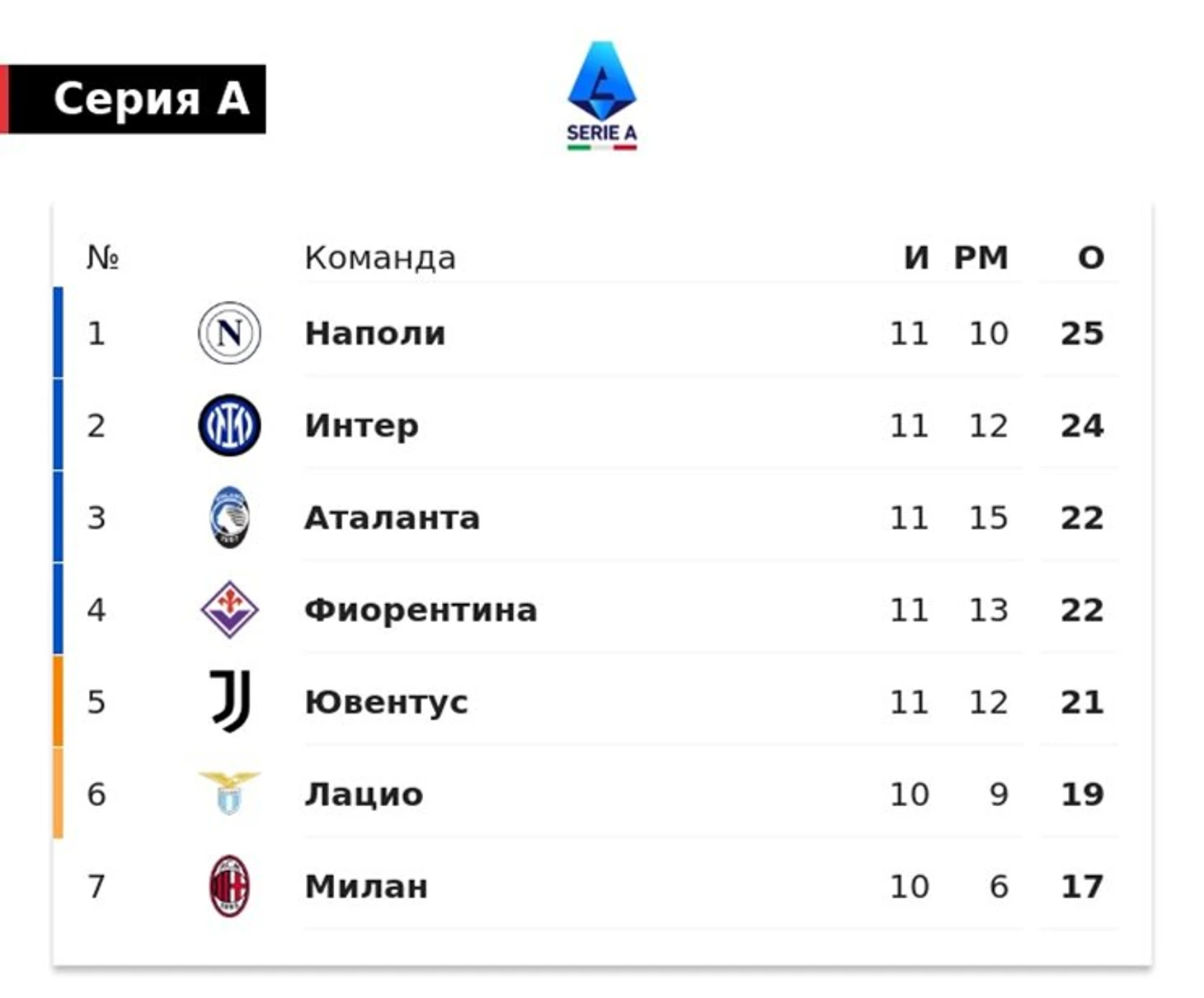 «Наполи» лидирует в Серии А после 11 туров, «Интер» – 2-й, «Аталанта» – 3-я, «Ювентус» – 5-й, у «Лацио» и «Милана» игра в запасе, «Рома» – 11-я