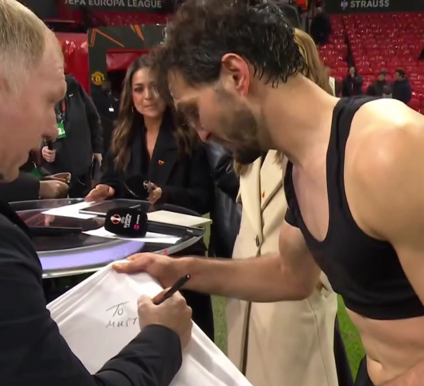 После матча полузащитник греческого клуба Оздоев попросил Пола Скоулза, который в этот момент работал у кромки поля в качестве эксперта на телевидении, расписаться на футболке.