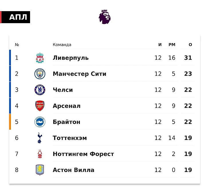 «Красные» набрали в чемпионате Англии 31 очко. «Ман Сити» идет вторым (23), следом – «Челси», «Арсенал» и «Брайтон» (по 22).