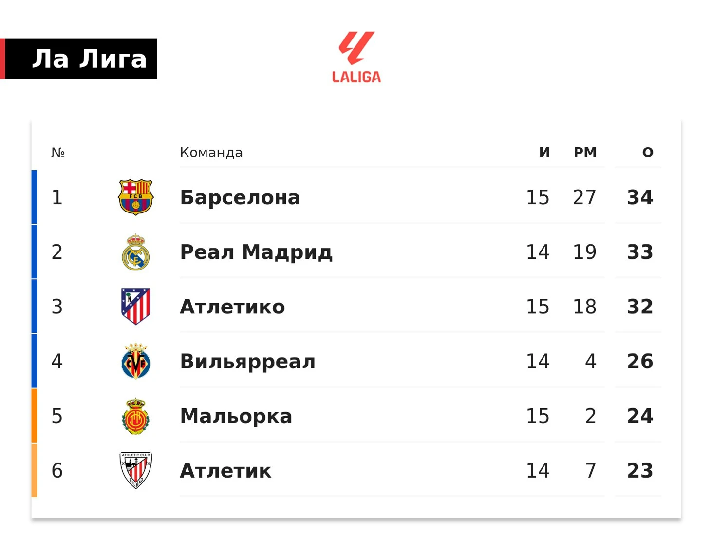 «Атлетико» занимает третью строчку, набрав в 15 турах 32 балла.