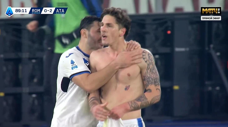 Празднуя гол, Дзаньоло снял футболку и подбежал к болельщикам бергамасков. За это он получил желтую карточку.