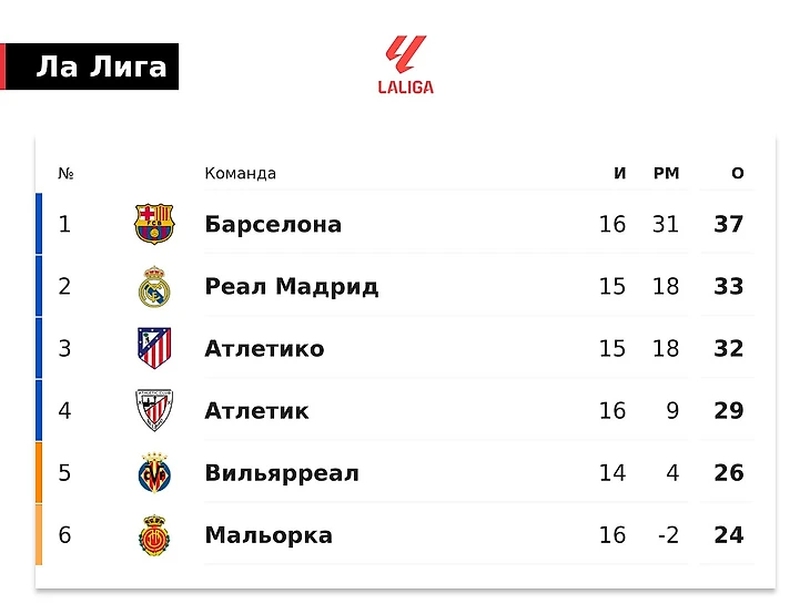 Каталонцы лидируют в чемпионате Испании, набрав 37 баллов за 16 игр. На счету «Реала» 33 очка после 15 матчей. «Атлетико» идет третьим с 32 баллами в 15 играх.