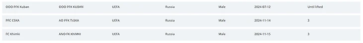 Начало бана ЦСКА отсчитывается с 14 ноября, «Химок» – с 15 ноября, «Кубани» – с 12 июля.
