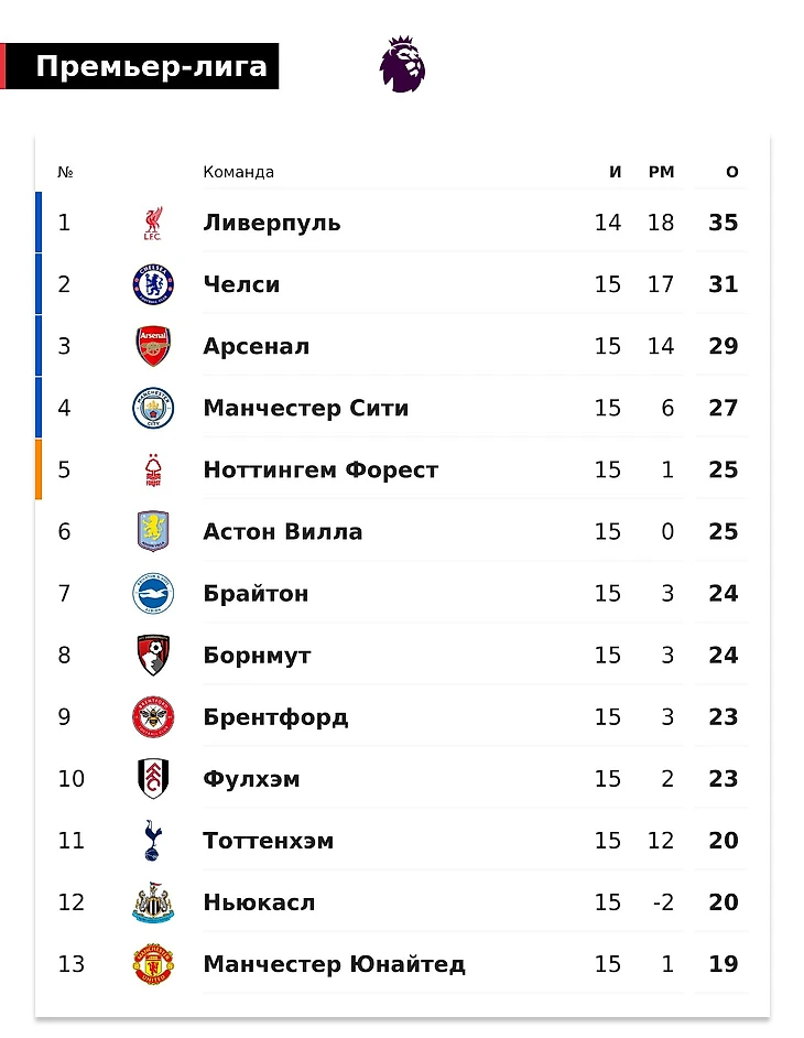«Ливерпуль» лидирует в АПЛ после 15-го тура с 35 очками и матчем в запасе. «Челси» – 2-й, «Арсенал» – 3-й, «Сити» – 4-й, «Тоттенхэм» – 11-й, «МЮ» – 13-й