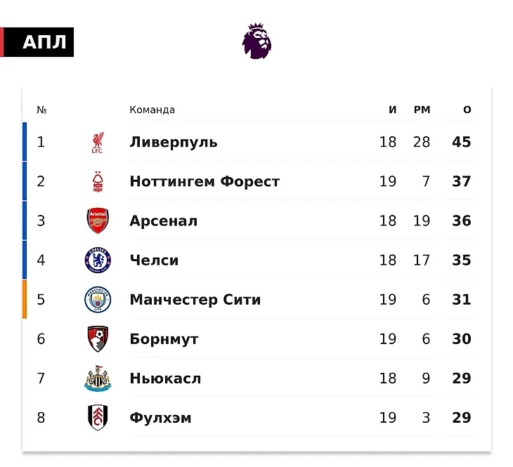 «Ливерпуль» лидирует в АПЛ, опережая «Ноттингем» на 8 очков, «Арсенал» – на 9, «Челси» – на 10. «Ман Сити» отстает на 14 баллов, «МЮ» – на 23