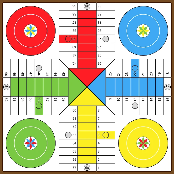 Для каждого игрока на поле парчиса имеется место старта, или база (в углу поля); выход из базы (цветная ячейка); место финиша, или дом (в центре поля) и дорожка к дому, или цветная дорожка. Цель парчиса – привести свои фишки в дом первым. Фишки двигаются против часовой стрелки с выхода из базы по общей дорожке к входу на свою цветную дорожку и затем, проходя по цветной дорожке, попадают в дом. Выход из базы является частью общей дорожки. Есть несколько безопасных ячеек на общей дорожке, выделенных тоном.