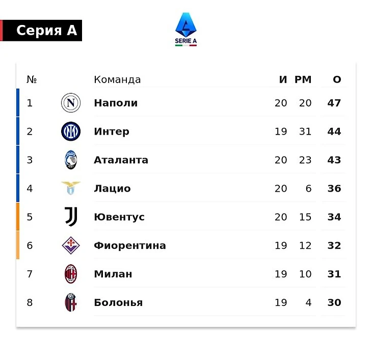 В топ-4 также входят «Аталанта» (43 очка) и «Лацио» (36). «Ювентус» (34) – 5-й, «Милан» (31) – 7-й.
