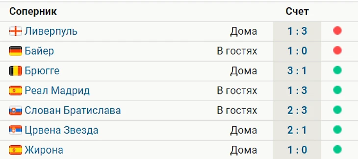 Ранее были одержаны победы над «Црвеной Звездой» (2:1), «Слованом» (3:2), «Реалом» (3:1) и «Брюгге» (3:1).