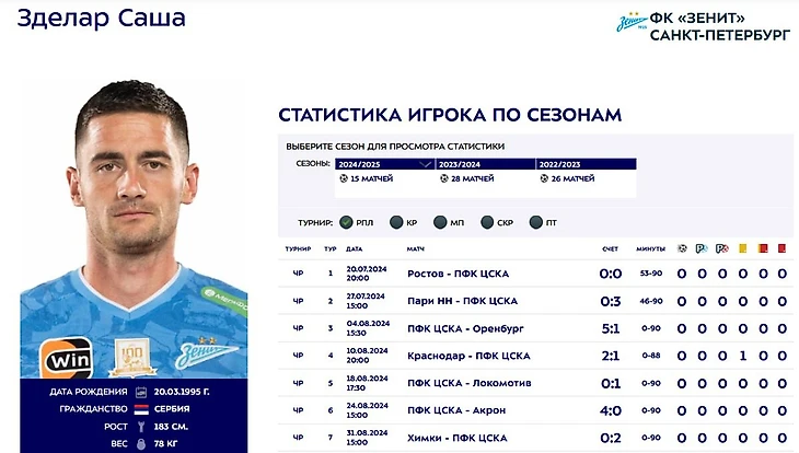 29-летний полузащитник заявлен за петербургский клуб в Мир РПЛ. Профиль игрока, перешедшего из ЦСКА, появился на сайте лиги в составе «Зенита».