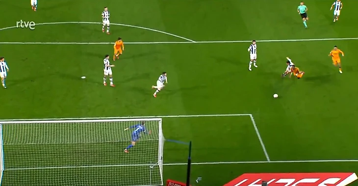 На 34-й минуте первого полуфинального матча Кубка Испании бразильский вингер протолкнул мяч в левой части штрафной и попытался обыграть защитника Хона Арамбуру, а затем упал на газон.