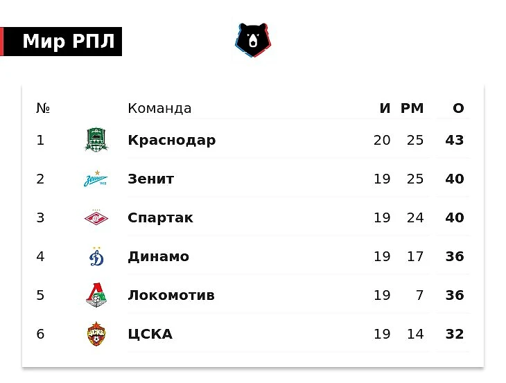 «Краснодар» вышел на первую строчку в таблице по итогам игрового дня. У него 43 очка после 20 игр, у «Зенита» и «Спартака» – по 40 при 19 матчах.