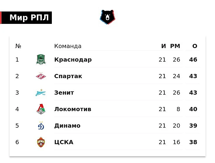 Московский клуб сравнялся с петербуржцами по очкам (по 43) и опередил за счет дополнительных показателей. До лидирующего «Краснодара» – 3 балла.