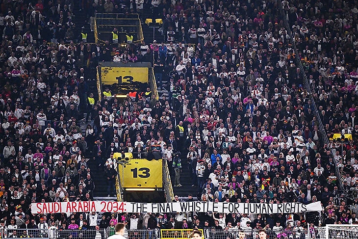 Вчера на игре сборных Германии и Италии (3:3) в Лиге наций фанаты растянули баннер с надписью: «Саудовская Аравия – 2034: финальный свисток для прав человека».