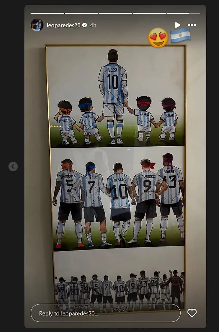 Полузащитник сборной Аргентины и «Ромы» выложил в соцсетях фото картины, на которой Месси предстает в роли наставника молодых игроков аргентинской сборной – Леандро Паредеса, Родриго Де Поля, Хулиана Альвареса и Кристиана Ромеро.