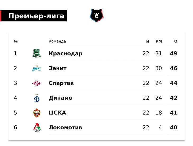 «Краснодар» лидирует в РПЛ с 49 очками после 22 туров. «Зенит» отстает на 3 балла, «Спартак» – на 5