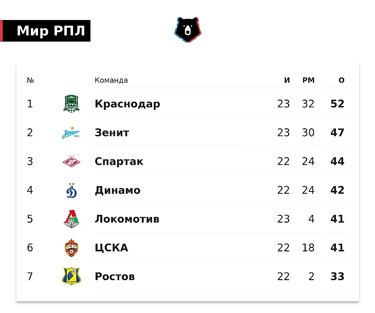 Следом на данный момент идут «Спартак» (44), «Динамо» (42), «Локомотив» (41) и ЦСКА (41).