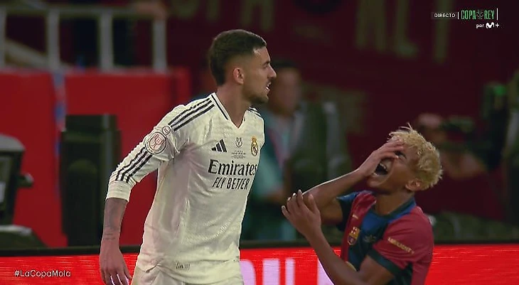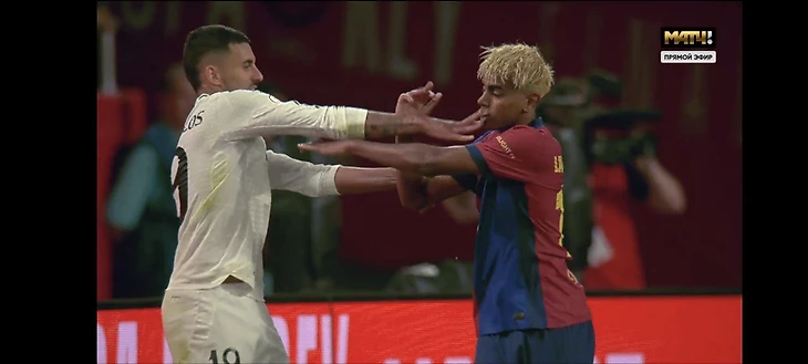 На 1-й добавленной к первому тайму минуте между Дани Себальосом и Ламином Ямалем произошла стычка. Полузащитник «Реала» отмахнулся от вингера «Барсы» и слегка задел ему лицо. После чего Ямаль упал на газон, схватившись за лицо.