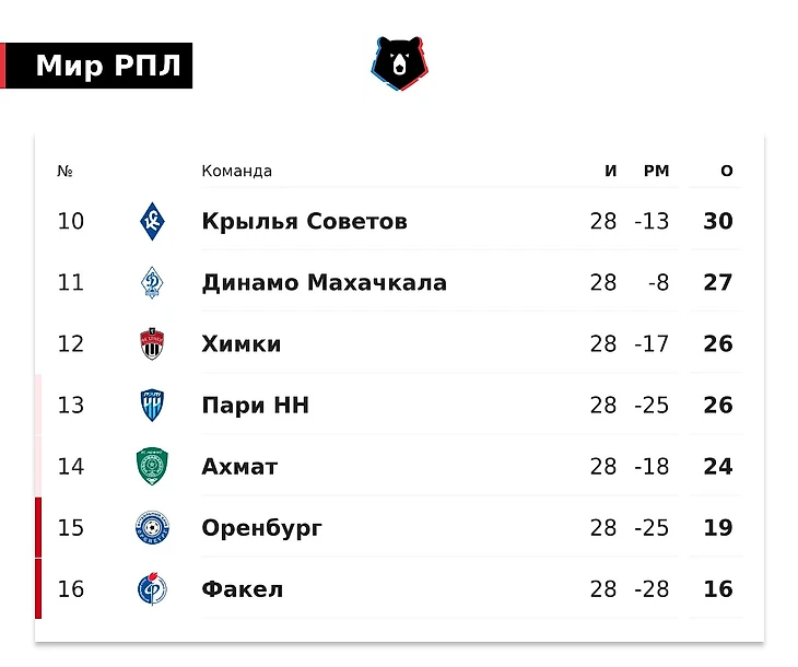 Нижегородцы набрали 26 очков и занимают 13-ю строчку, уступая «Химкам» по дополнительным показателям. Ниже расположились «Ахмат» (24 балла), «Оренбург» (19) и «Факел» (16).